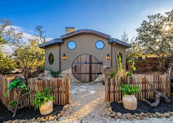 Nestled in the heart of Fredericksburg, the Traveler Hobbit House Hot Tub Bbq Wifi Fredericksburg Villa offers a whimsical retreat, blending rustic charm with contemporary comforts. This unique accommodation, adorned with hobbit-inspired architecture, promises an enchanting escape for travelers seeking a blend of adventure and relaxation. With free Wi-Fi available throughout the villa, guests can stay connected while enjoying their serene surroundings. The accommodations at the Traveler Hobbit House are designed with comfort in mind. Each room features cozy furnishings and inviting decor, ensuring a restful stay. The villa's hot tub beckons after a day of exploration, providing the ultimate place to unwind under the stars, while the BBQ area allows guests to indulge in delicious outdoor dining, surrounded by nature's beauty.